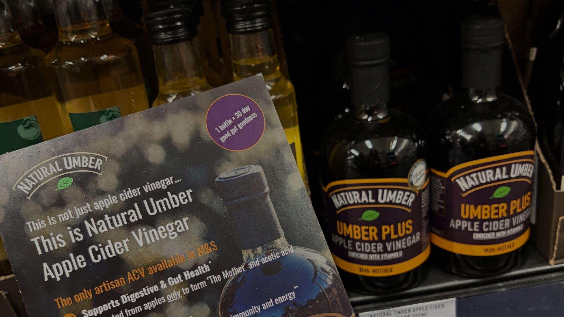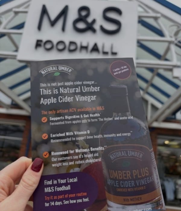 The product is Umber Plus by Natural Umber. Made by Michael and Luke Mackle, a father and son with seven decades of apple-growing expertise, using apples from their own UK and Irish orchards. It's now stocked in M&S Brooklands, M&S Guildford, and other selected stores — and the fact that it made it onto M&S shelves at all tells you something.
