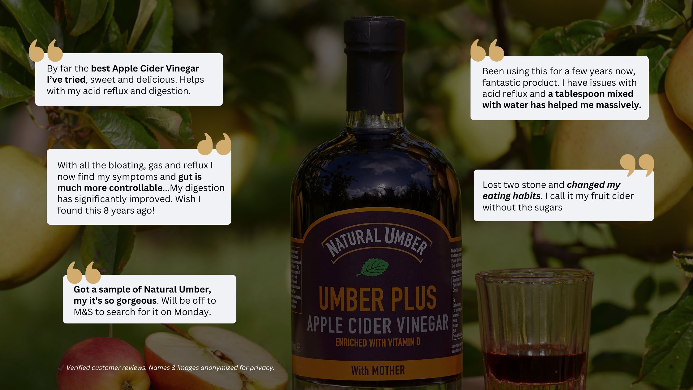 "Apple cider vinegar is something I've always tried to incorporate into my diet but often found it so sharp and acidic. Since being introduced to Natural Umber I'm hooked. There really is no other ACV on the shelf that can compare. It tastes so sweet and is delicious."